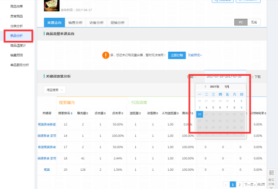 我們可以查看單品分析然后通過(guò)多日的關(guān)鍵詞搜索引流數(shù)據(jù)對(duì)比,找出流量下滑的關(guān)鍵詞,然后將這個(gè)關(guān)鍵詞放入市場(chǎng)-搜索關(guān)鍵詞中查找。觀看近日的市場(chǎng)搜索人氣曲線,如果是關(guān)鍵詞的市場(chǎng)市場(chǎng)搜索人氣下滑,我們就可以更換掉這個(gè)詞。如果市場(chǎng)搜索人氣沒(méi)問(wèn)題,那就是這個(gè)詞的市場(chǎng)競(jìng)爭(zhēng)加大了,我們可以做一下這個(gè)關(guān)鍵詞的引流成交,增加權(quán)重.