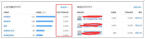 你像這個(gè)店鋪,我現(xiàn)在看到的是最近30天的PC端的數(shù)據(jù),排名前五的進(jìn)店關(guān)鍵詞,除了第二個(gè)“餐具套裝”有0.53%的下單轉(zhuǎn)化率以外,另外的四個(gè)關(guān)鍵詞的下單轉(zhuǎn)化率都是0,這至少說明對于PC端來講,進(jìn)店關(guān)鍵詞是非常不精準(zhǔn)的。