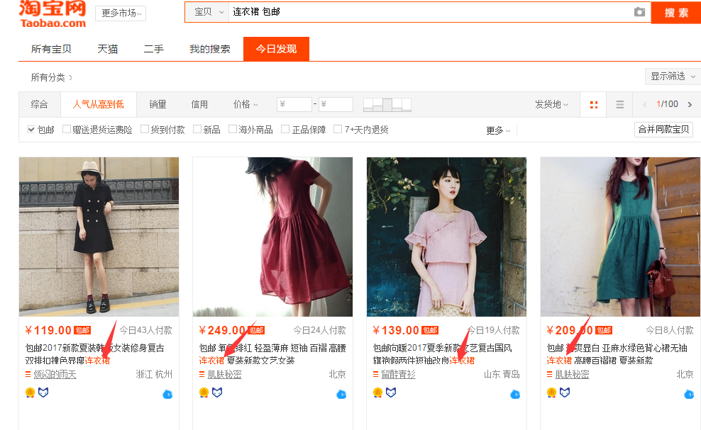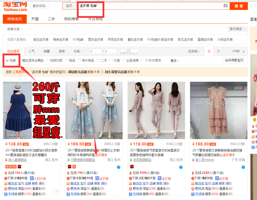 第二,大家發(fā)現(xiàn)沒有,在我們搜索后寶貝標題,只描紅了‘連衣裙’這個詞根 ,而‘包郵’并沒有被描紅,這說明了什么?這說明‘包郵’是一個系統(tǒng)默認關(guān)鍵詞。在買家搜索‘包郵’的時候,搜索引擎會直接默認展示包郵產(chǎn)品,在標題中有無‘包郵’,都是無所謂的,搜索引擎不會去甄別他。