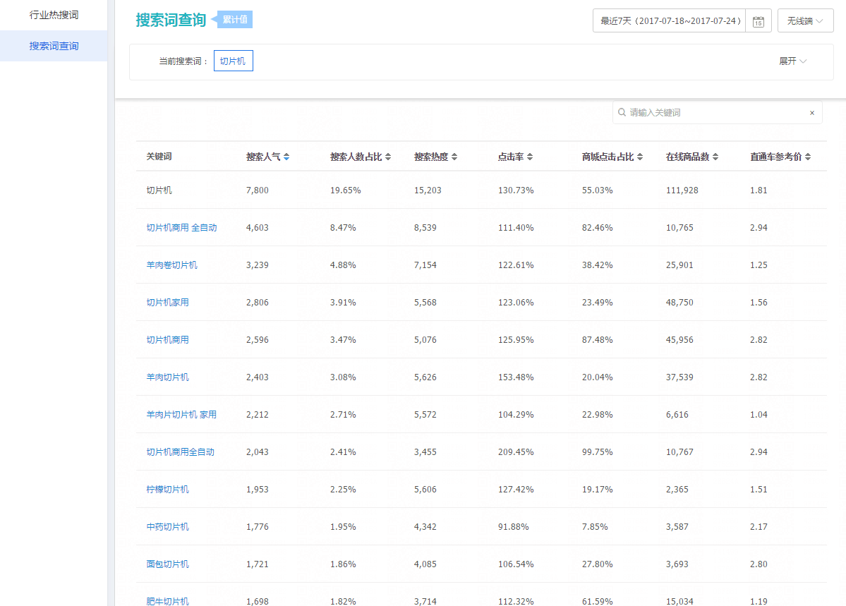 大家在選好產(chǎn)品之后,首先要去做的不是作圖、上新,而是去數(shù)據(jù)分析。最簡單的方法要去看兩個數(shù)據(jù),一是寶貝數(shù)、而是搜索指數(shù)。今天我們以我們分析出來的切片機舉例,看下面數(shù)據(jù):