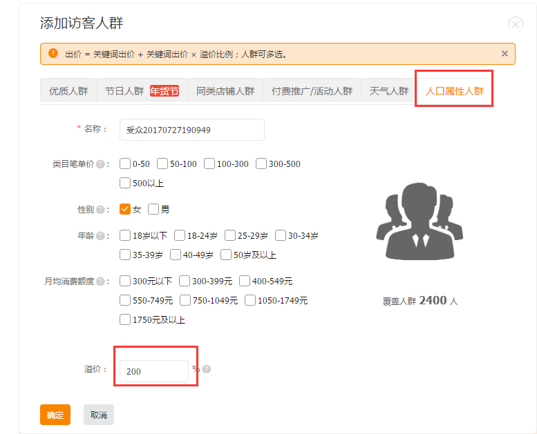 2.關(guān)鍵詞推廣下面精選人群,添加人群。添加訪(fǎng)客人群,選擇人口屬性人群,根據(jù)上面自己生意參謀的訪(fǎng)客分析來(lái)設(shè)置類(lèi)目比單價(jià),性別,年齡和月均消費(fèi)額度。調(diào)整溢價(jià),保留30%利潤(rùn)自己調(diào)整相應(yīng)的溢價(jià)。
