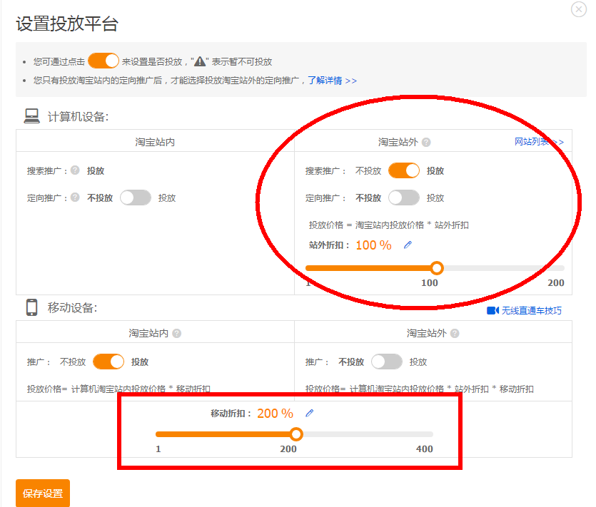 2、投放平臺(tái)設(shè)置:計(jì)算機(jī)設(shè)備的淘寶站外折和移動(dòng)設(shè)備的移動(dòng)折扣,是否有設(shè)置出價(jià)高于100%的現(xiàn)象