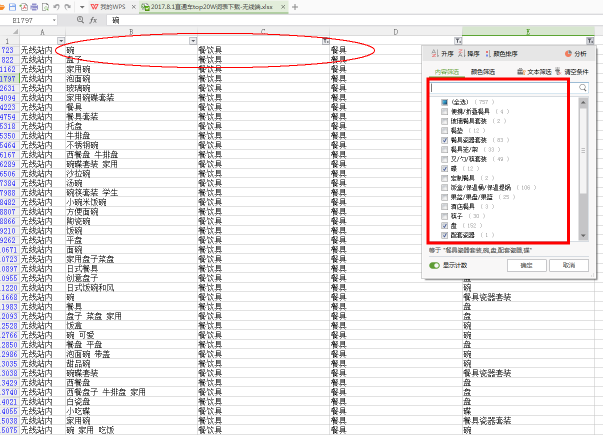 當(dāng)然還一個(gè)方法就是利用提高質(zhì)量分來(lái)降低平均點(diǎn)擊花費(fèi),但是我們能控制的是它的相關(guān)性和創(chuàng)意質(zhì)量。相關(guān)性我之前寫(xiě)過(guò)圖文怎么去解決相關(guān)性的問(wèn)題,無(wú)非是查看寶貝類目和關(guān)鍵詞是否是相符的,當(dāng)然我們用寶貝推詞的時(shí)候就能看到相關(guān)性,選相關(guān)性高的詞去添加是最好的,如果覺(jué)得詞不夠,可以去下載top20W詞表,我們點(diǎn)擊篩選按鈕。選擇自己寶貝本身的一級(jí)類目和二級(jí)類目再選符合的關(guān)鍵詞。再添加會(huì)相關(guān)性方面很高,質(zhì)量分不會(huì)太低。