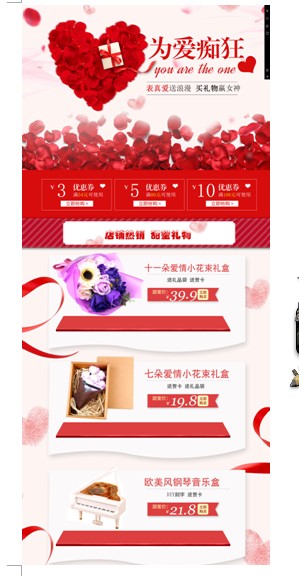 圖2則是緊扣七夕主題,一打開頁面就看到很大的“為愛癡狂”的海報。可以說當(dāng)我們一點進(jìn)店鋪的時候,第一時間就感受到了節(jié)日的氣氛。玫瑰花,桃心等元素都是第一時間讓人聯(lián)想起情人節(jié)的浪漫元素。還有紅色和粉色的色彩搭配,烘托出了節(jié)日的氛圍。產(chǎn)品也是根據(jù)節(jié)日的特點,給消費者選擇了花朵,音樂盒等產(chǎn)品作為主推款。