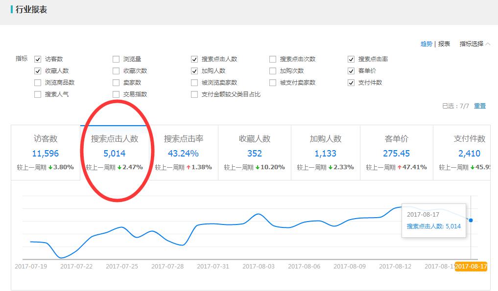 然后我們?cè)偃バ袠I(yè)大盤里面查看一下,下滑那段時(shí)間的搜索點(diǎn)擊人數(shù)。如果整個(gè)行業(yè)的趨勢(shì)都是處于下滑的階段,那么就沒(méi)有必要去大驚小怪。這個(gè)和旺季、淡季、活動(dòng)、天氣、物流等一些因素都是有影響的。