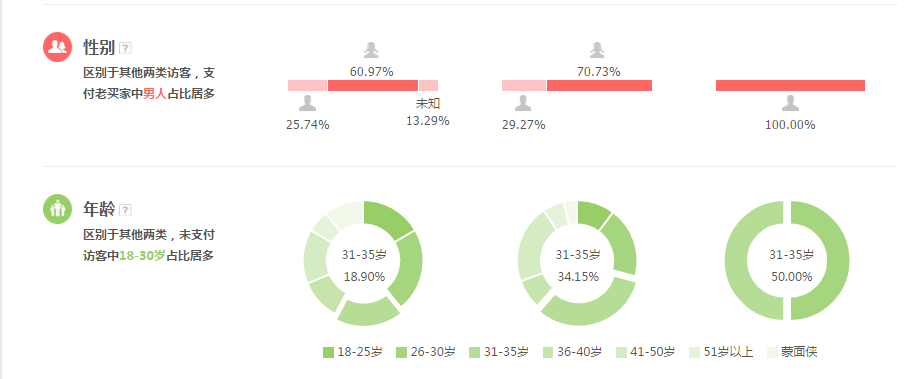 根據(jù)上圖,我們可以做出一個(gè)簡(jiǎn)單的分析,0-20元的人群轉(zhuǎn)化率才1.01%,他的消費(fèi)能力很弱,這部分人群占了總流量的57%,另外人群呢是45元以上人群,轉(zhuǎn)化比較好。大家可以看出來(lái),在這個(gè)店鋪可以說(shuō)是消費(fèi)層級(jí)越高的人,轉(zhuǎn)化率也會(huì)越高。店鋪低客單流量這么多可以說(shuō)是因?yàn)榍捌谝鳑](méi)注意客單方面,導(dǎo)致人群標(biāo)簽沒(méi)打好,那么我們可以通過(guò)關(guān)聯(lián)營(yíng)銷來(lái)增加客單價(jià),使店鋪人群定位往高客單人群發(fā)展。