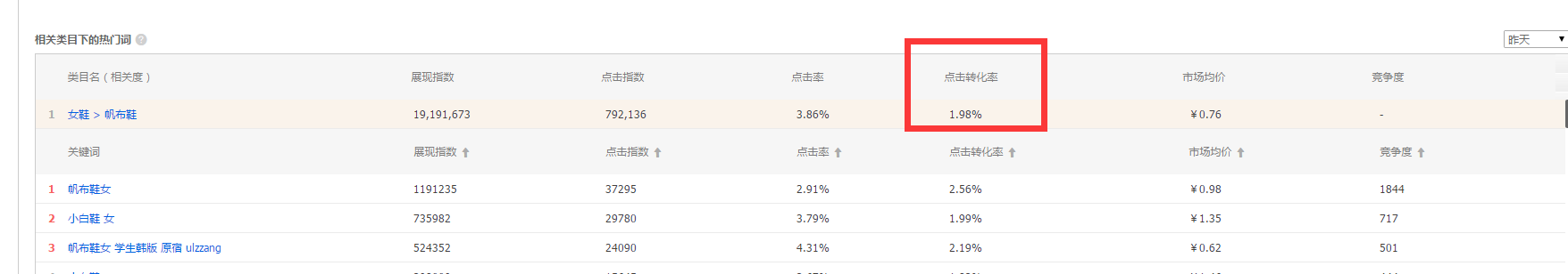 接下來(lái)去直通車的流量解析輸入帆布鞋查找轉(zhuǎn)化率(流量解析-推廣詞表下載-相關(guān)類目下的熱門詞)