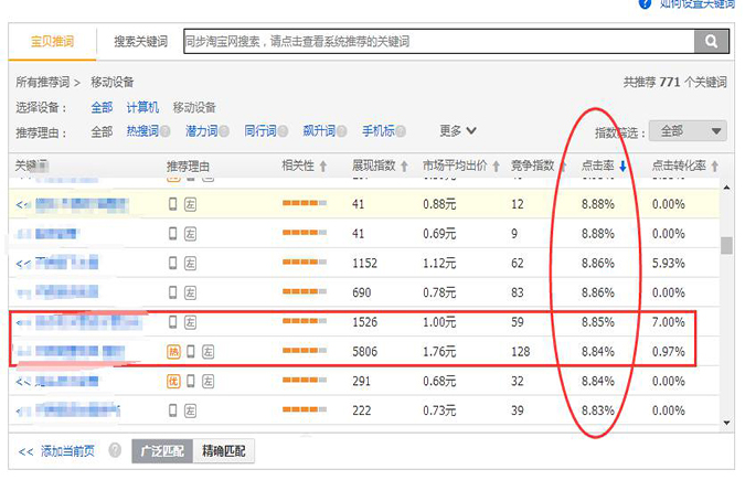 2.優(yōu)化方法,選詞的時候重點添加點擊率比較高的關(guān)鍵詞,首先我們要在直通車添加關(guān)鍵詞中找到以點擊率比較高的關(guān)鍵詞。