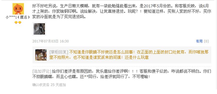 圖上的賣家和顧客干起來了,因為生產(chǎn)日期的問題。一個說沒有生產(chǎn)日期,一個說有生產(chǎn)日期,是你看錯了地方,有生產(chǎn)日期的照片你故意不拍??吹竭@種情況,我只會說“呵呵”,然后走人。顧客態(tài)度惡劣不假,但賣家不但沒有平息怒火,反而被顧客給激怒了。一旦激怒,就不會冷靜的思考問題,更不會合理的對待問題。對于這種不成熟的賣家來說,前來觀看回評解釋的潛在顧客,絕對是不會下單的,源于沒有保障,在他家購物嚴重缺乏安全感。