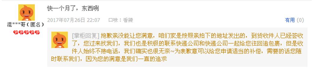 這是一個關(guān)于“丟件”,最后導(dǎo)致差評的案例。顧客反映“丟件”了,賣家首先做的是:道歉,其次又把他們跟蹤包裹,解決問題的環(huán)節(jié)在“回評解釋”里做了描述,表明為這事,他們確實有跟快遞公司溝通。最后,雖然是按照顧客留下的地址發(fā)貨,快遞公司反饋收件人也簽收了。按理說跟賣家已經(jīng)沒有關(guān)系了,但是為了讓后來看產(chǎn)品的“潛在顧客”放心的購買,賣家提出:“給予適當(dāng)?shù)难a償”。