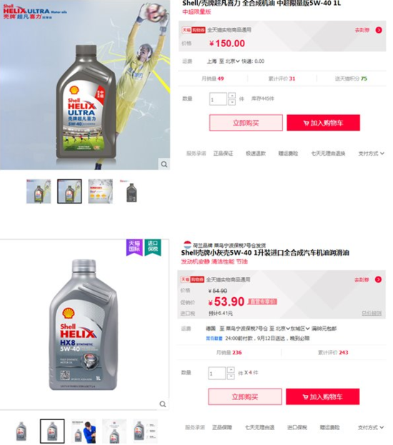 目前在天貓國際上搜索“殼牌”字樣,依舊還有多位商家公開售賣殼牌的潤滑油產(chǎn)品,且月銷量不菲。而對比同樣5W-40的“1升裝全合成機油”,天貓國際與天貓旗艦店的價位分別是53.9和150元,兩者價位懸殊巨大,間接導(dǎo)致天貓殼牌官方旗艦店的月銷售額受到?jīng)_擊影響。