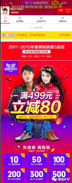 如上圖所示,是2016年駱駝旗艦店雙11首頁(yè)頁(yè)面,頁(yè)面核心位置展現(xiàn)出來(lái)“滿499減80”的促銷利益點(diǎn),強(qiáng)化促銷,并且在下面放置一排優(yōu)惠券以吸引客戶眼球,整體頁(yè)面也配合官方大促的熱烈紅色元素為主,把全店的促銷氛圍營(yíng)造得很好。駱駝旗艦店在2016年度雙11大戰(zhàn)中,收獲5.02億總銷售額,連續(xù)蟬聯(lián)鞋服品牌冠軍。