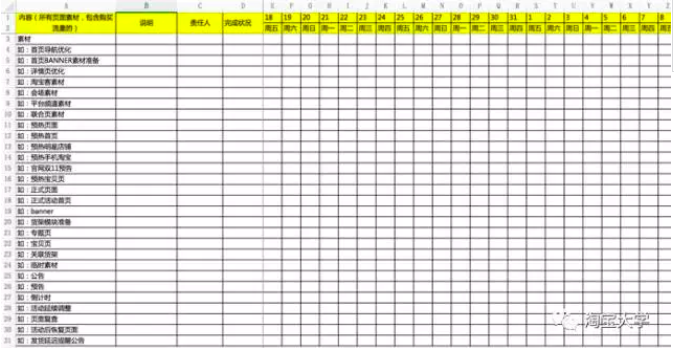 視覺還需要依據(jù)官方活動(dòng)節(jié)點(diǎn)完成相關(guān)的頁(yè)面和圖片制作,并且要提前準(zhǔn)備,提前測(cè)試,做到高效,及時(shí)。當(dāng)然,為了更好地完成視覺工作,建議店鋪視覺要把相關(guān)的工作任務(wù)羅列成如下圖所示的工作進(jìn)度清單表出來(lái),方便及時(shí)推進(jìn)。