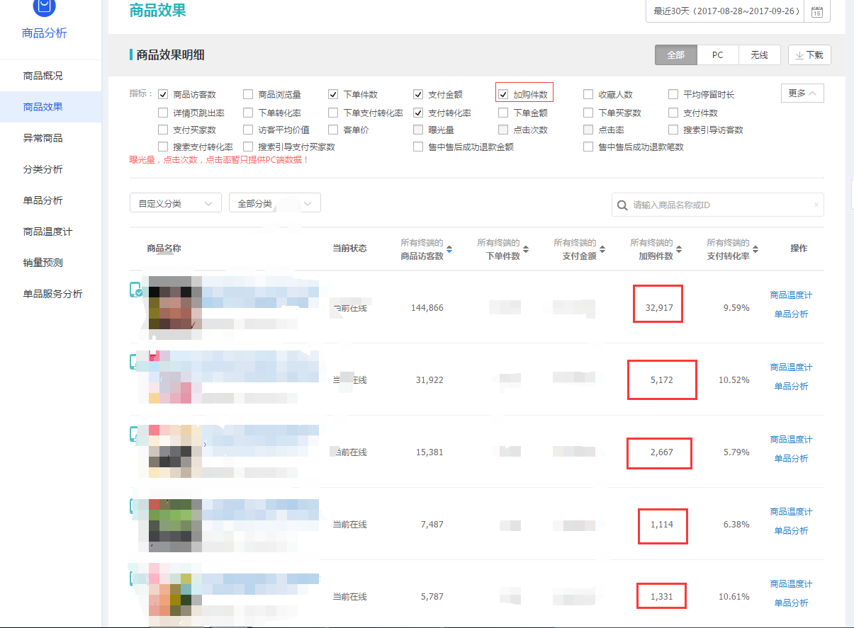 第三種,加購率,加入購物車的買家證明對商品的購買意圖非常明確,可能是個人原因,后面購買或者是商品還差某一個小點沒有打動她,離轉(zhuǎn)化是非常接近了,那么通過這個數(shù)據(jù)我們同樣可以分析出來他是否是潛在的爆款