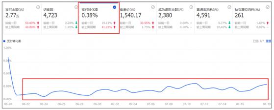 看這個店鋪的轉(zhuǎn)化率,最高點(diǎn)是618大促的時候,其他的時間都會比較穩(wěn)定的。如果你的店鋪,綜合支付轉(zhuǎn)化率出現(xiàn)了持續(xù)下滑的時候,那必須要去找原因了,比如流量不精準(zhǔn)了,出現(xiàn)了強(qiáng)力競爭對手了等等,然后去想應(yīng)對的策略。
