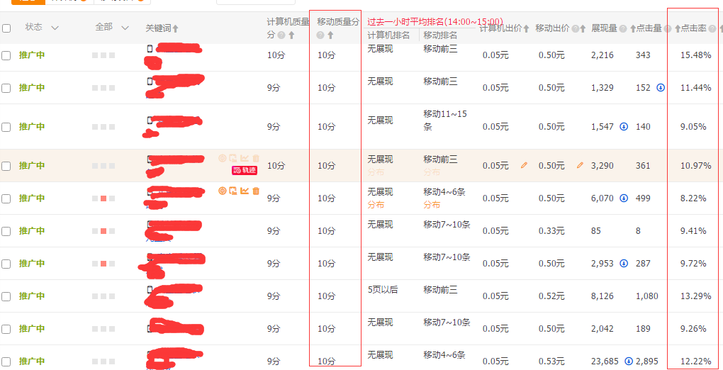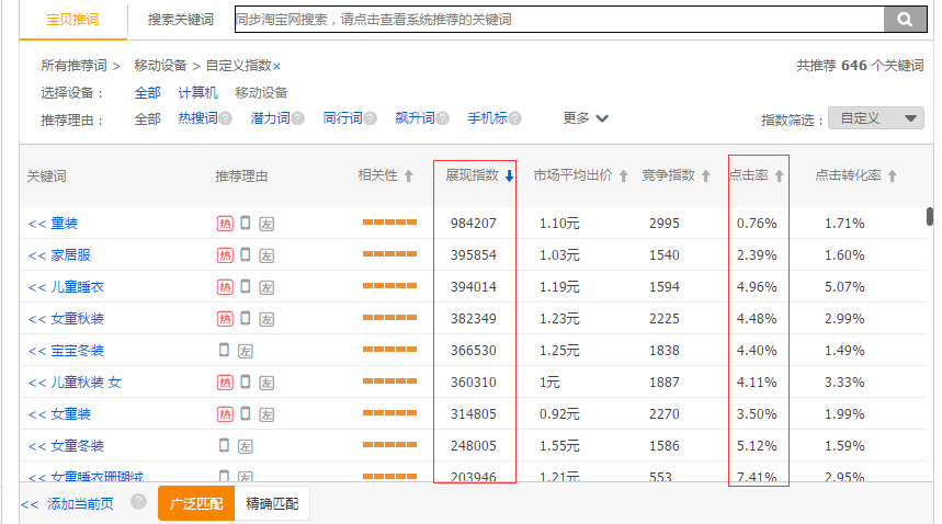 第二步:在確定款式有潛力,圖片點擊沒問題的情況下,重新篩選關(guān)鍵詞,需要展現(xiàn)量非常大,且點擊率好的詞10個左右(展現(xiàn)量大是為了后續(xù)人群測試,點擊率好是為了能保證出高價就會有點擊),選好詞之后,所有的詞無線端都出價卡到4-6位,PC端可以不管,愿意花錢的掌柜可以卡到前三,這樣點擊率更好,同時計劃的日 限額提到500元一天。這個階段只要點擊率和加購,不看產(chǎn)出。