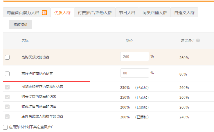 第四步:在這個時候我們需要開始測試人群,因為人群會是之后帶來產(chǎn)出的主要來源,所以必須要測試精準(zhǔn),每個款的人群都不一樣,可以借鑒,但不能全部套用。這里就是建議所有的人群都最好單個打開,不要在測試階段就嘗試組合人群。這里是建議優(yōu)質(zhì)人群里后面四個人群,以及自定義人群里面的所有單個人群,都建出來,進行測試。測試人群是一個需要長時間段的事情,我們看數(shù)據(jù)一定要根據(jù)近7 天或者14天的數(shù)據(jù),在一個時間段的情況下,看點擊率,不太好的先暫停然后進行記錄,以免后續(xù)重復(fù)使用。