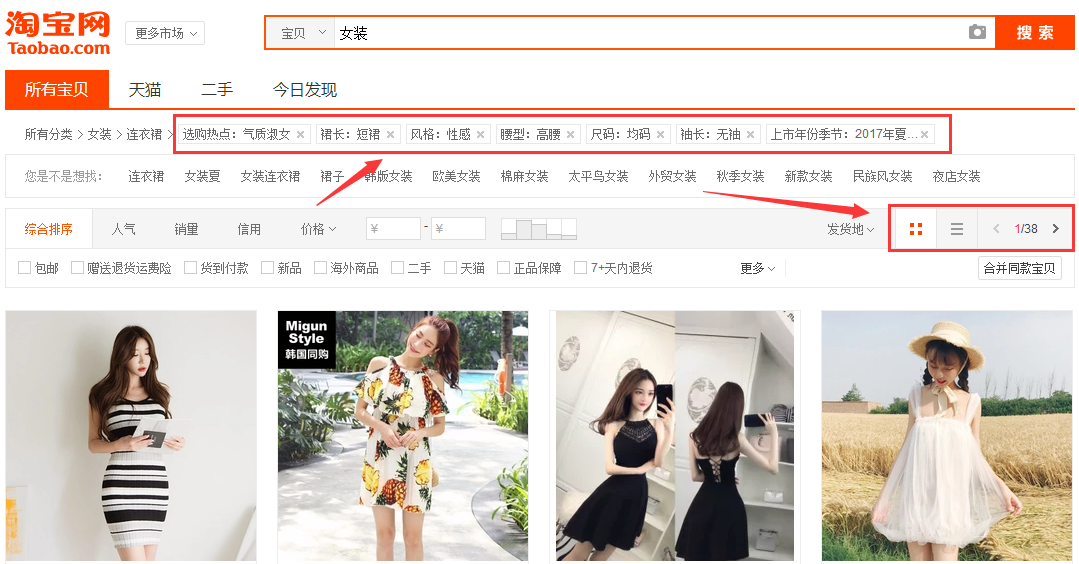格、品牌、材質(zhì)、每個人的購買習(xí)慣等都是非常多樣化的。而在這里只有和你相同,相似的寶貝才有可能和你產(chǎn)生競爭的交集,這樣進(jìn)過了篩選后的競爭對手會少很多!女裝這個幾百萬寶貝的大類目,當(dāng)我們限制條件之后,就會發(fā)現(xiàn),類似的寶貝卻只有38頁了,那就僅僅1800多個寶貝而已了。