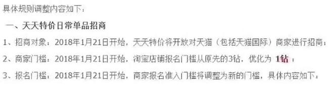 我們都知道很早以前天天特價的報名條件是:只要你的店鋪滿足了三顆星,店鋪動態(tài)評分達到要求,基本都是可以申報的,但是后面進行了調整,是需要商家的等級達到三顆鉆才可以(具體的大家可以去看天天特價報名規(guī)則)。但是2018年1月15日,天天特價又出了新的規(guī)則,那就是:天天特價將在1月21號針對天貓/天貓國際商家開始招商。相信,這對很多中小賣家來說又是一個噩耗了,因為這意味著中小賣家不僅要和行業(yè)TOP商家競爭,還要和天貓/天貓國際商家競爭。