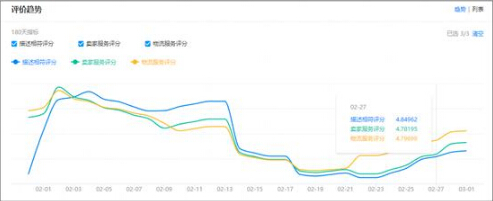 你應(yīng)該建立DSR評(píng)分的監(jiān)控表格(或者直接從生意參謀里面也是可以看的),然后如果你發(fā)現(xiàn)這三項(xiàng)指標(biāo)中的某些指標(biāo)連續(xù)四天下降的話,第五天你就要去處理。為什么呢?因?yàn)槿绻愕冗B續(xù)7天下降的話,就來(lái)不及了。