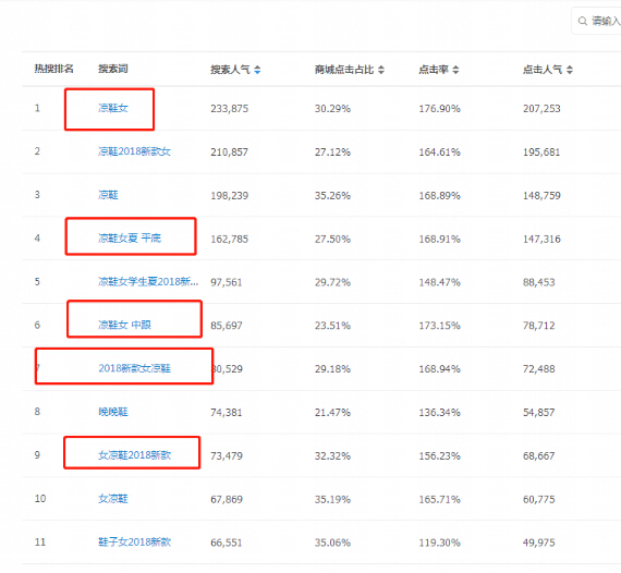 單從排名來(lái)看,拆分搜索關(guān)鍵詞:高跟、涼鞋、女。但是我們搜索的是連續(xù)關(guān)鍵詞并不是單個(gè)詞根所以在排名上關(guān)鍵詞連續(xù)排名靠前,既不是坑位大小,也不是產(chǎn)值多少,連續(xù)性詞根關(guān)鍵詞是排名的關(guān)鍵,排名會(huì)靠前。基于這一點(diǎn)的標(biāo)題,通過(guò)市場(chǎng)行情熱搜詞排名,把搜索量高的關(guān)鍵詞整體添加標(biāo)題。