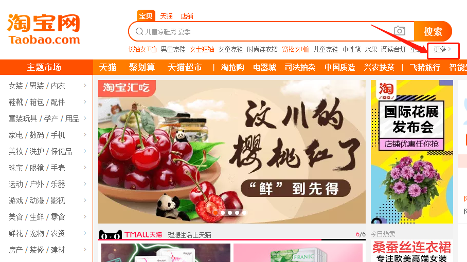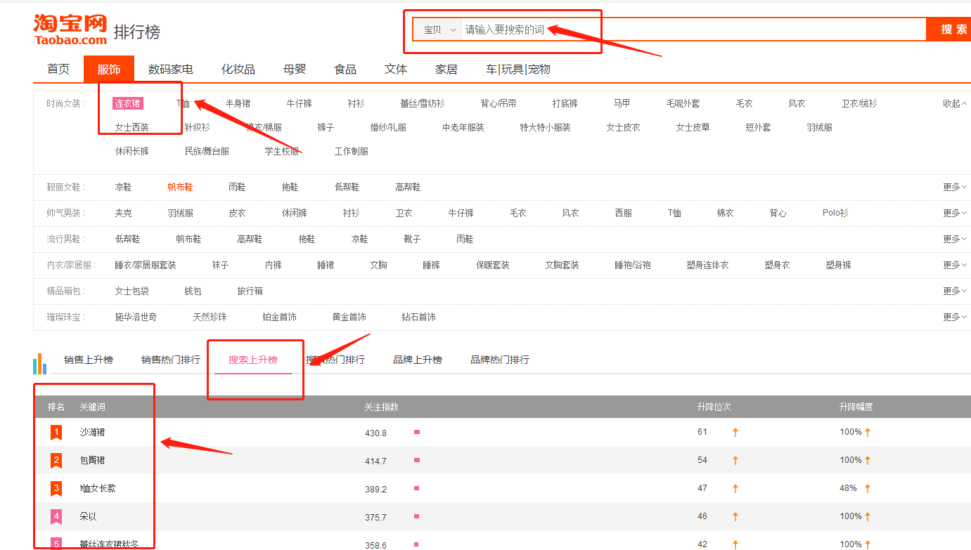 3. 淘寶上升詞選款:選擇最近搜索上升詞,淘寶首頁(yè)搜索框——更多——選擇類目——選擇搜索上升榜