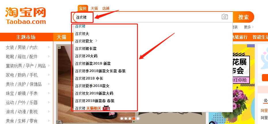 打開(kāi)淘寶網(wǎng)---在搜索欄里搜索你的產(chǎn)品的關(guān)鍵詞。就比如連衣裙