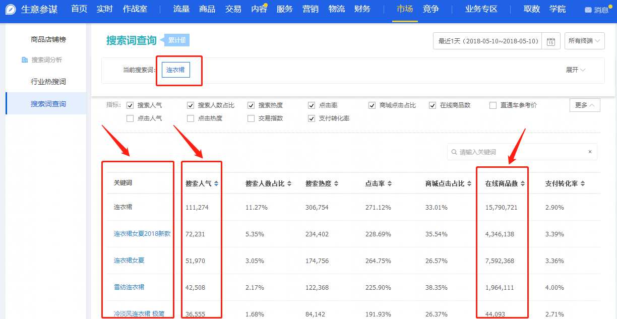 6. 生意參謀,市場(chǎng)行情選款:精確、可以準(zhǔn)確查看相關(guān)延伸詞、搜索人氣、在線商品數(shù),從而選擇競(jìng)爭(zhēng)度高的商品進(jìn)行打造。