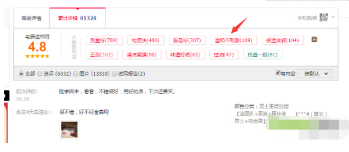 舉個(gè)例子,這個(gè)寶貝評(píng)價(jià)一共8萬多條,你就能挖掘出買家的幾個(gè)消費(fèi)痛點(diǎn):