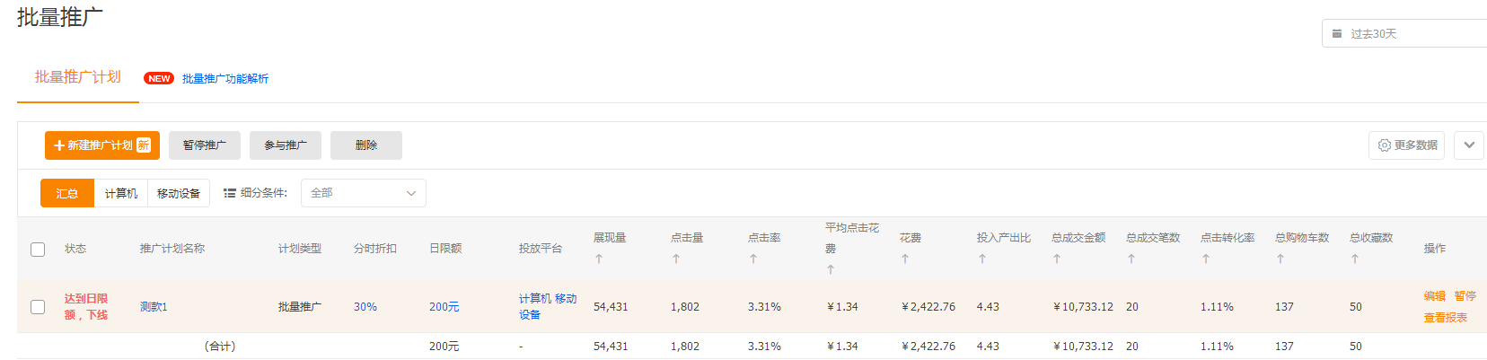 4、設(shè)置完之后,價格由系統(tǒng)自動出價,出價策略可以選擇測款和平銷。以下是最近30天的操作數(shù)據(jù)。