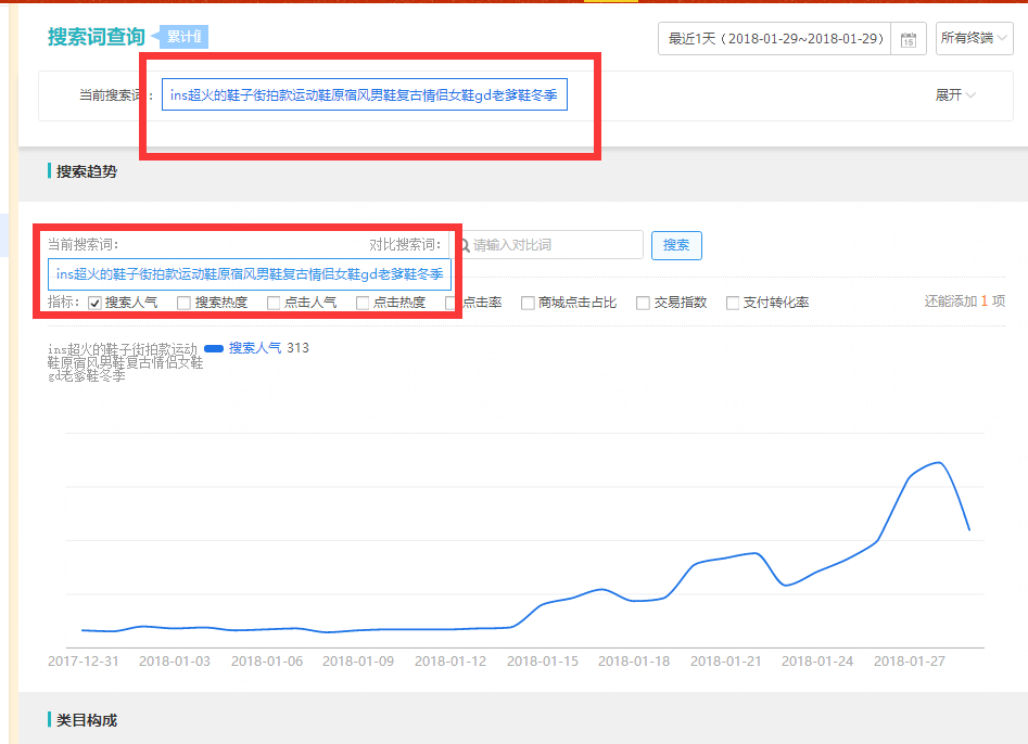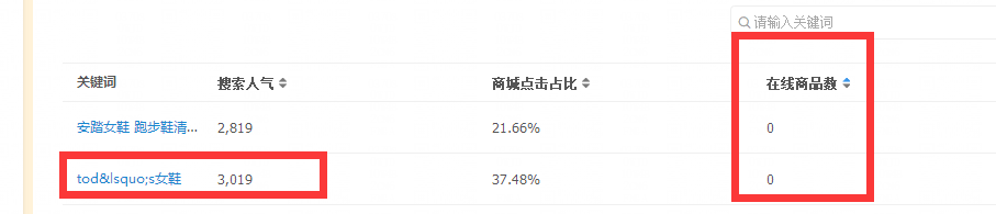 就像這樣的一個關(guān)鍵詞,在線商品數(shù)是零,搜索人氣也是非常的高,商城占比也是非常的ok,但是有沒有考慮過,一個在線商品數(shù)是零的。為什么會有搜索人氣?而且這么好的一個關(guān)鍵詞,同行為什么沒有去使用呢?那就說明這樣的一個詞。是一個異常的詞