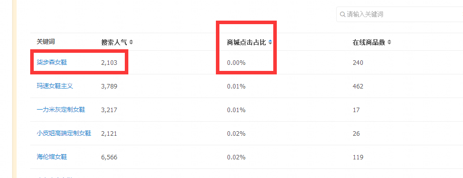 就像這樣的一個關(guān)鍵詞,在線商品數(shù)非常的低只有240,搜索人氣也非常的高,達到2103。唯獨只有商城點擊占比只有0%,但是這樣的詞,天貓店鋪都沒有去用,天貓店鋪都看不上的,那我們用來做什么呢?對吧。