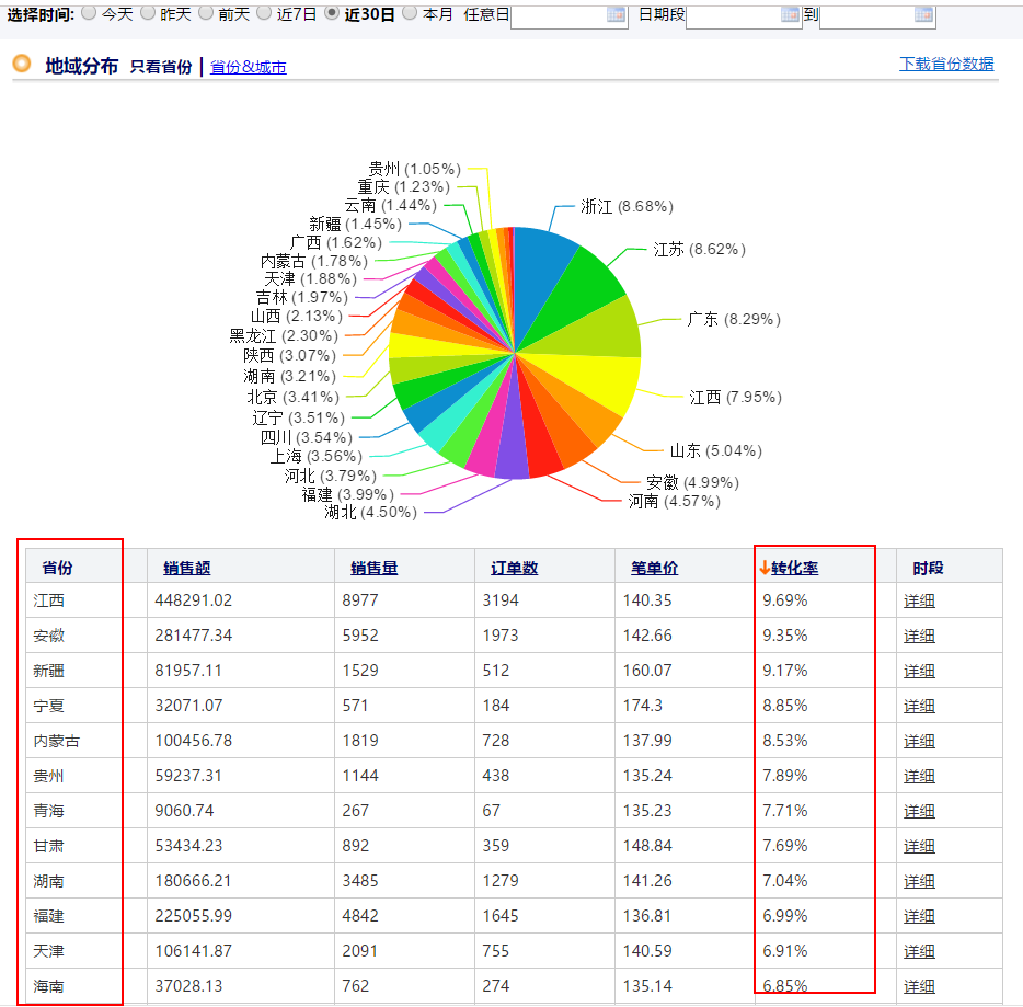 直通車推廣初期 我們可以參照生意經(jīng)近一個月每個省份對應(yīng)的轉(zhuǎn)化率選擇轉(zhuǎn)化率比較高的地域進行投放,如下圖:
