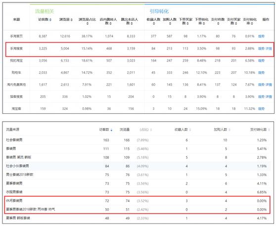 尤其是搜索進(jìn)店流量和直通車(chē)進(jìn)店流量,這種不精準(zhǔn)會(huì)直接導(dǎo)致轉(zhuǎn)化率下滑,并且伴隨的還有頁(yè)面停留時(shí)間短、跳失率高等表現(xiàn)。并且這種不精準(zhǔn),主要是進(jìn)店關(guān)鍵詞不精準(zhǔn),你可以在生意參謀——商品——商品分析——單品分析中進(jìn)行分析,看最近30天的無(wú)線端數(shù)據(jù),在手淘搜索那一項(xiàng),點(diǎn)擊“詳情”,可以看一下進(jìn)店關(guān)鍵詞的表現(xiàn)