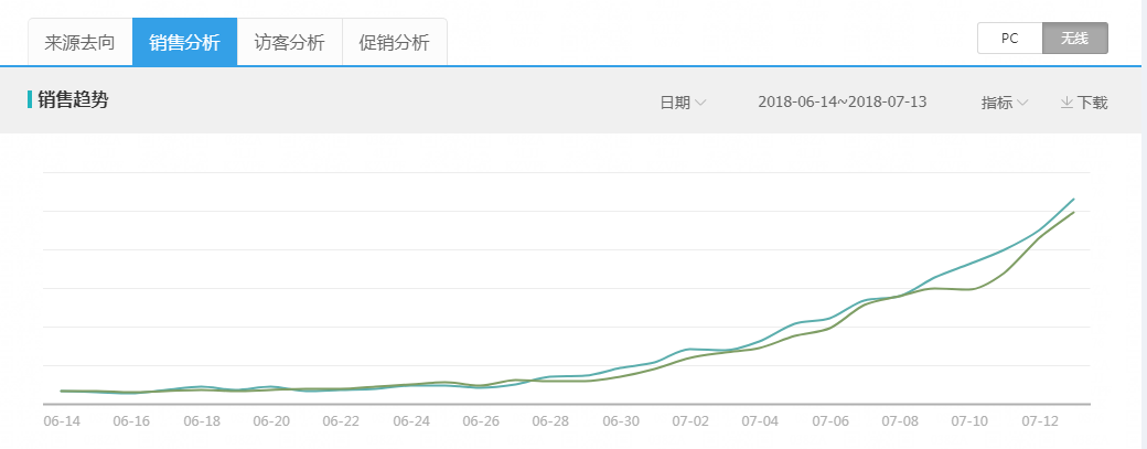 下面是我測試的一個美妝美妝店單品,6.26開始加SKU,至7.12數(shù)據(jù)漲了將近15倍左右。