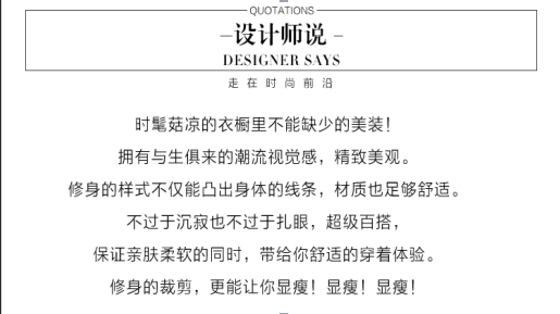 4.賣點解析,主要夸買家,每一個買家購物對自己想去購買的產(chǎn)品有一個美好的期望,比如一件衣服穿在自己的身上會顯瘦,你的寶貝某一部分的設計能突出買家優(yōu)美的線條等,這樣的賣點讓買家更愿意去了解你的寶貝。標品也是一樣賣點解析,產(chǎn)品有什么優(yōu)勢,有什么功能等等。