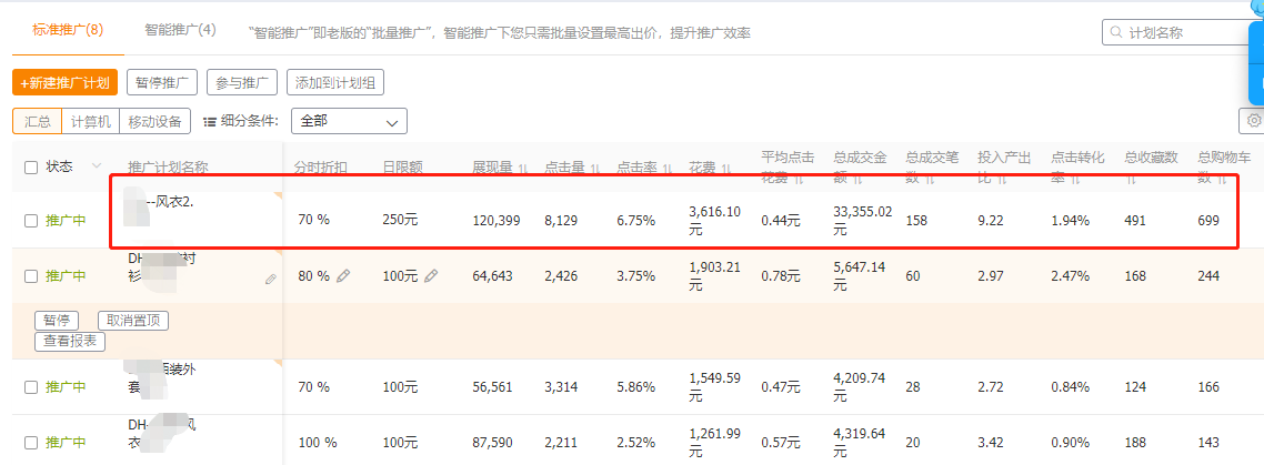 店鋪所有的款統(tǒng)一上智能計劃去測款,有一兩款流量比較突出的就拿出來單獨做標準計劃進行重點精準投放,配合上店鋪活動從而去提升店鋪的轉(zhuǎn)化。