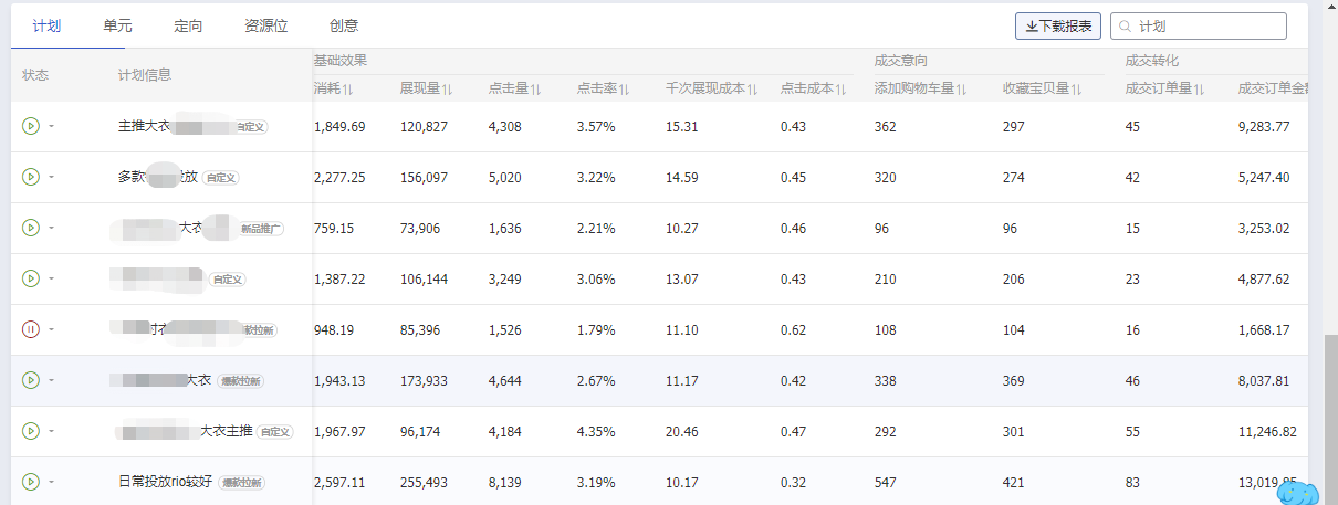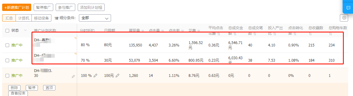 從下圖可以看出,店鋪基本上要靠一個主推款去保持轉(zhuǎn)化,其他的輔推計劃也要重點做好維護。智能計劃也要不斷地配合測款,針對不同時期不同產(chǎn)品建計劃。