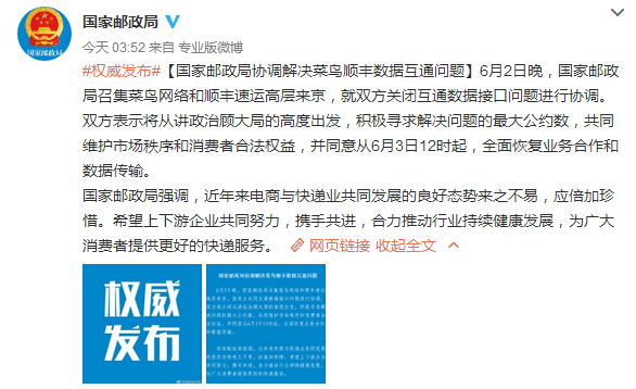 國家郵政局今天凌晨發(fā)布公告,稱國家郵政局召集菜鳥網(wǎng)絡(luò)和順豐速運高層來京,就雙方關(guān)閉互通數(shù)據(jù)接口問題進行協(xié)調(diào)。菜鳥、順豐同意從6月3日12時起,全面恢復(fù)業(yè)務(wù)合作和數(shù)據(jù)傳輸。