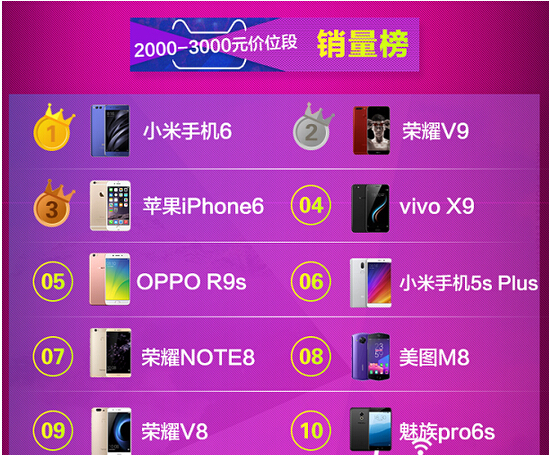 另外,在天貓2000~3000元價(jià)位段手機(jī)銷量榜單,小米手機(jī)6、榮耀V9、蘋果iPhone 6拿下前三,vivo X9、OPPO R9s、小米手機(jī)5s Plus、榮耀Note8、美圖M8、榮耀V8、魅族pro 6s依次位列前十名。值得一提的是,熱銷榜前十名只有美圖M8、小米手機(jī)6、榮耀V9是今年發(fā)布的新機(jī),其余機(jī)型皆為去年的產(chǎn)品,均有不同程度的優(yōu)惠促銷,而小米6與美圖M8未進(jìn)行任何優(yōu)惠活動(dòng),取得如此成績(jī)實(shí)屬不易。