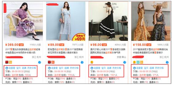 為了不占用太多的篇幅,所以我就截取了第二行的四個(gè)寶貝,看到了么,紅框里面的內(nèi)容(這里安裝一個(gè)插件就可以了,我用的是店查查,沒有做廣告之嫌,別誤會(huì),我只是用的很方便,你也可以用別的),這四款寶貝的剩余下架時(shí)間都在半小時(shí)之內(nèi)。我是沒有截圖,截圖了你會(huì)發(fā)現(xiàn)第一頁基本都是這種情況。