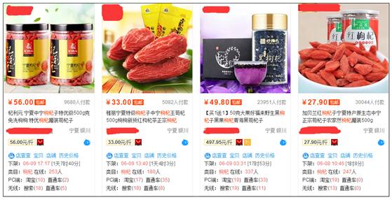 競爭越激烈的大類目,下架時(shí)間的權(quán)重就越高,反之,這個(gè)權(quán)重就會(huì)越低。其實(shí),跟上面的原理是一樣的,當(dāng)競品數(shù)量多的時(shí)候,就需要通過下架時(shí)間調(diào)整排序規(guī)則。前面的連衣裙肯定是大類目了,這個(gè)我們就不用懷疑了,那我們看一個(gè)小類目,比如說枸杞,然后我們就搜索最大的詞“枸杞”: