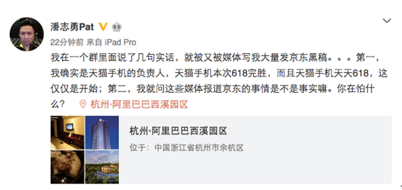 對此,潘志勇在微博上表示:“我在一個群里面說了幾句實話,就又被媒體寫我大量發(fā)京東黑稿。第一,我確實是天貓手機的負責人,天貓手機本次618完勝,而且天貓手機天天618,這僅僅是開始;第二,我就問這些媒體報道京東的事情是不是事實嘛。你在怕什么?”