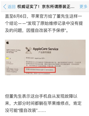 6月7日,消費者董先生在微博實名爆料,吐槽京東蘋果專營店竟然販售假的正品手機。