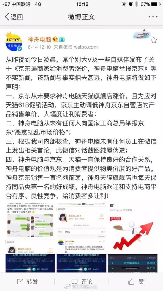 京東方面表示,從昨夜到今日凌晨,個(gè)別大V及一些自媒體發(fā)布了關(guān)于《京東逼商家給消費(fèi)者漲價(jià),神舟電腦舉報(bào)京東》等不實(shí)新聞,該新聞與事實(shí)相去甚遠(yuǎn),神舟電腦特做如下聲明: