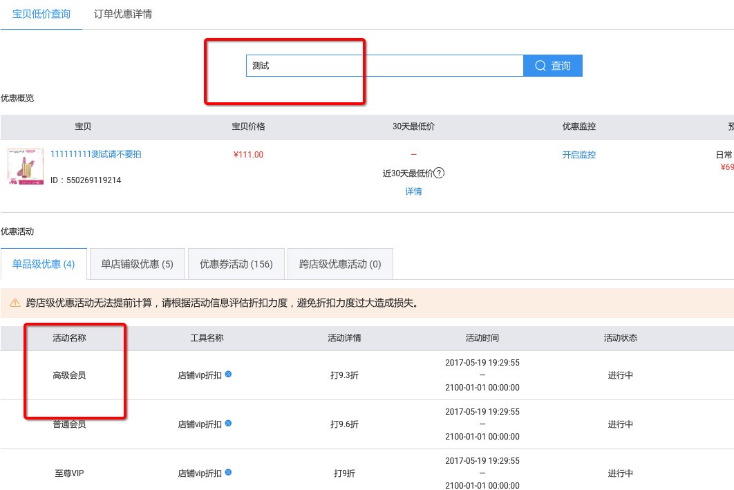 2)、如何排查我的活動(dòng)是哪個(gè)工具設(shè)置的:登錄優(yōu)惠監(jiān)控,輸入寶貝id,查詢?cè)撋唐穼?duì)應(yīng)的所有活動(dòng)信息即可。