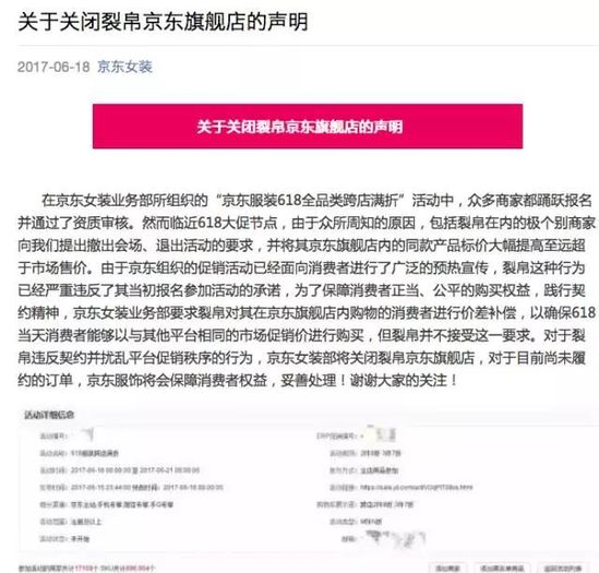 京東女裝業(yè)務(wù)部要求裂帛對(duì)其在京東旗艦店內(nèi)購(gòu)物的消費(fèi)者進(jìn)行價(jià)差補(bǔ)償,但裂帛不接受這一要求。京東方面認(rèn)為裂帛違反契約并擾亂平臺(tái)促銷秩序,因此決定關(guān)閉裂帛京東旗艦店。