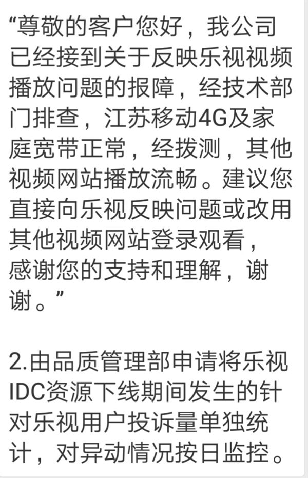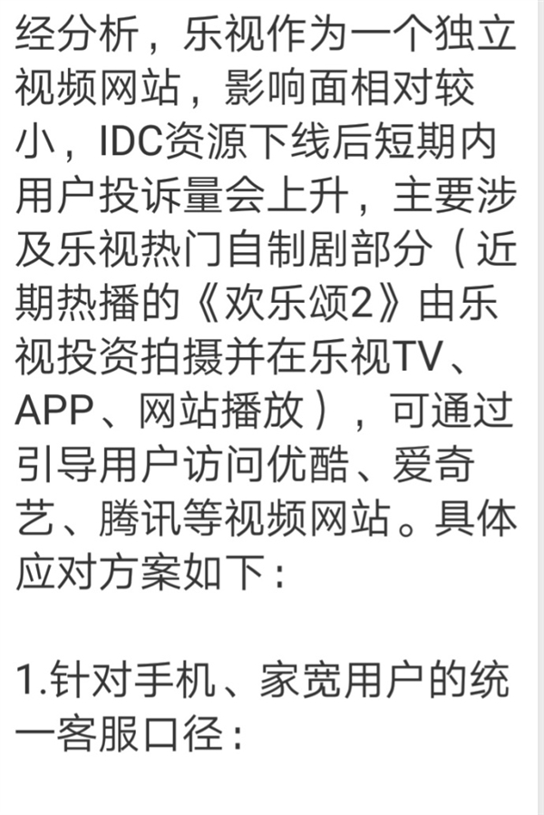 文件指出,IDC資源下線后,短期內(nèi)用戶投訴量會上升,主要涉及樂視熱門自制劇部分,比如《歡樂頌2》??赏ㄟ^引導(dǎo)用戶訪問優(yōu)酷、愛奇藝等視頻網(wǎng)站。