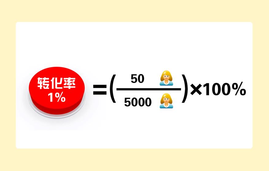 舉例來說如圖3:如果我們的店鋪當(dāng)天的訪客數(shù)量(UV)為5000,其中50名用戶有在我們的店鋪進行了消費成交行為。那么,其轉(zhuǎn)化率就是(50/5000)×100%=1%。同樣的道理,我們只要歸納出進店人數(shù)點擊量,和成交人數(shù),就可以很快算出店鋪的轉(zhuǎn)化率了。
