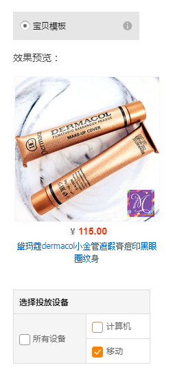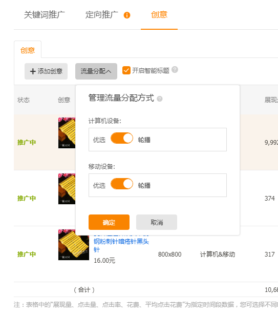 首先添加創(chuàng)意圖,創(chuàng)意圖默認(rèn)只能從主圖中選擇,一個(gè)正常店鋪想開(kāi)通本地上傳功能的條件是直通車月花費(fèi)高于3000,并且推廣天數(shù)大于20天。由于無(wú)線端流量遠(yuǎn)遠(yuǎn)大于pc端流量,所以投放創(chuàng)意圖時(shí)建議勾選移動(dòng)端設(shè)備。
